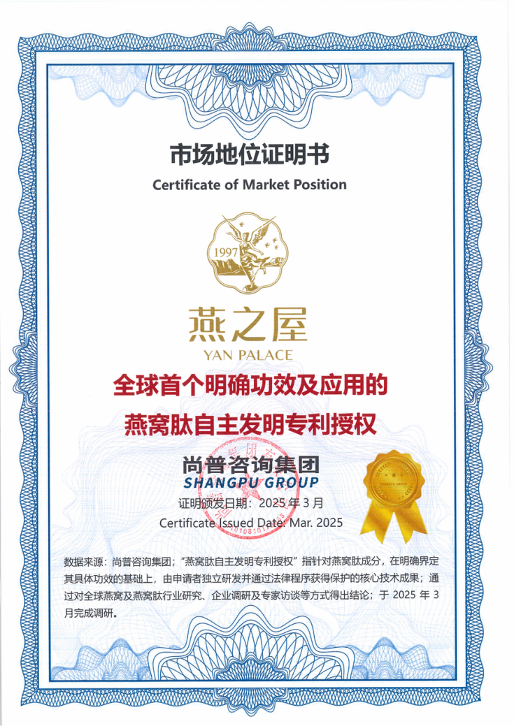 隨著燕窩產品的創新和加工技術的提升,生物酶解技術也被應用于燕窩的加工中,隨之誕生了“燕窩肽”。燕窩肽的研究,代表了燕窩行業從傳統滋補邁向科學滋養的關鍵轉折。燕之屋研發人員經過數百次測驗,以定向酶切技術提取燕窩肽,從而使其擁有更加優異的功能性。這一突破性成果獲得了權威機構的認可。經尚普咨詢集團專業認證,燕之屋獲得“全球首個明確功效及應用的燕窩肽自主發明專利授權⑤ ”市場地位證明書。